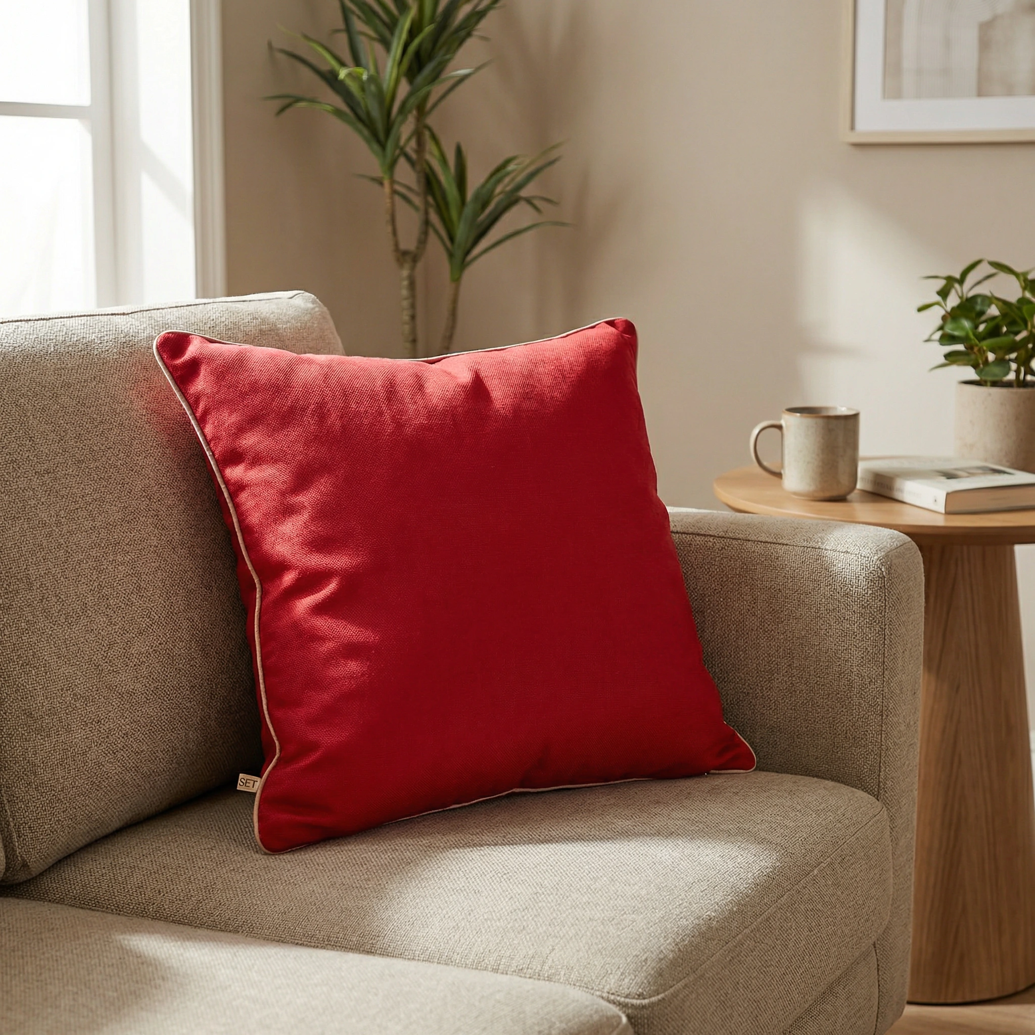 Kırmızı renkli kırlent kılıfı. Alt kısmında fermuar detayı bulunur.