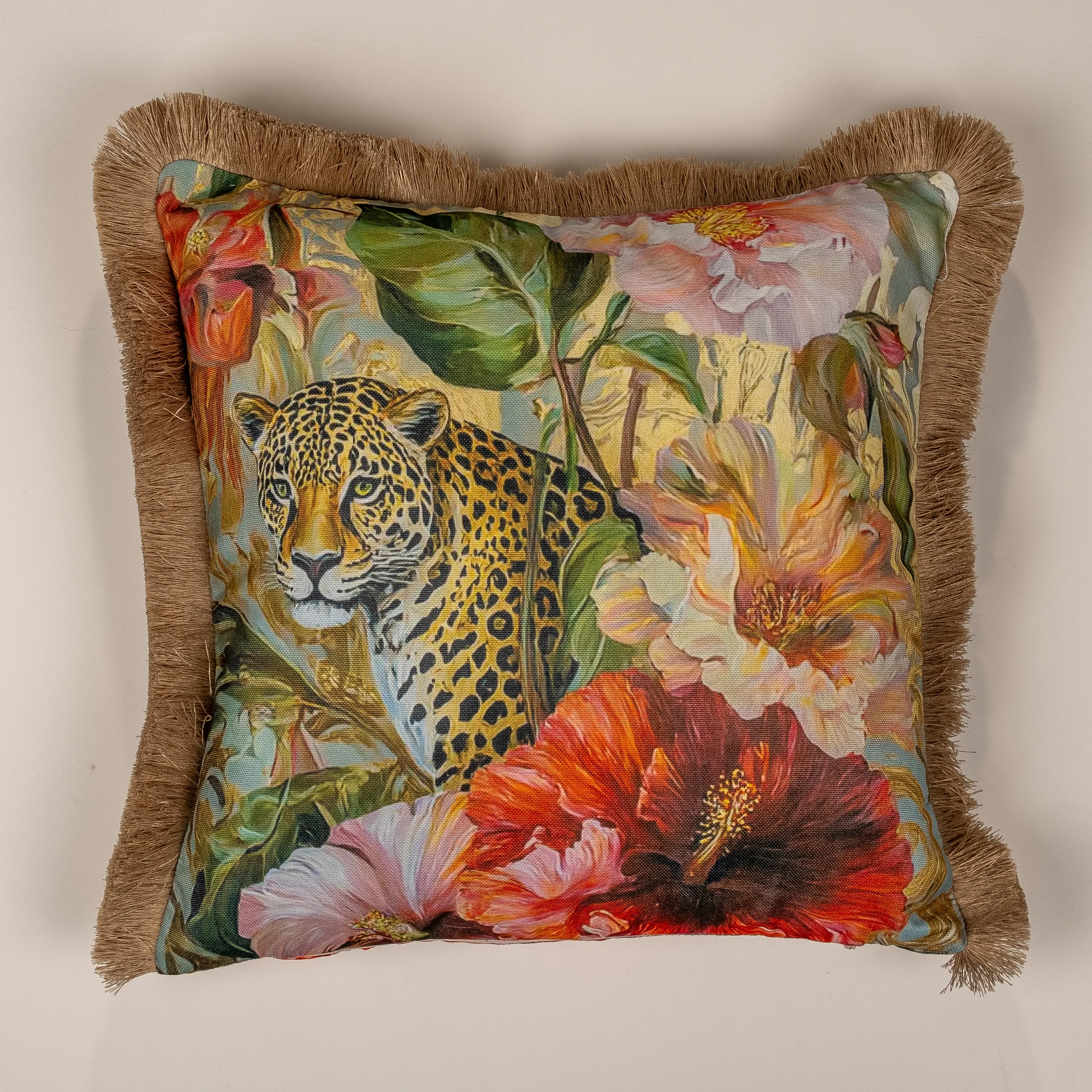 Çok renkli, orta bölümünde leopar figürlü ve çiçek motifli, kenarları saçak detaylı kırlent kılıfı. Alt kısmında fermuar detayı bulunur.