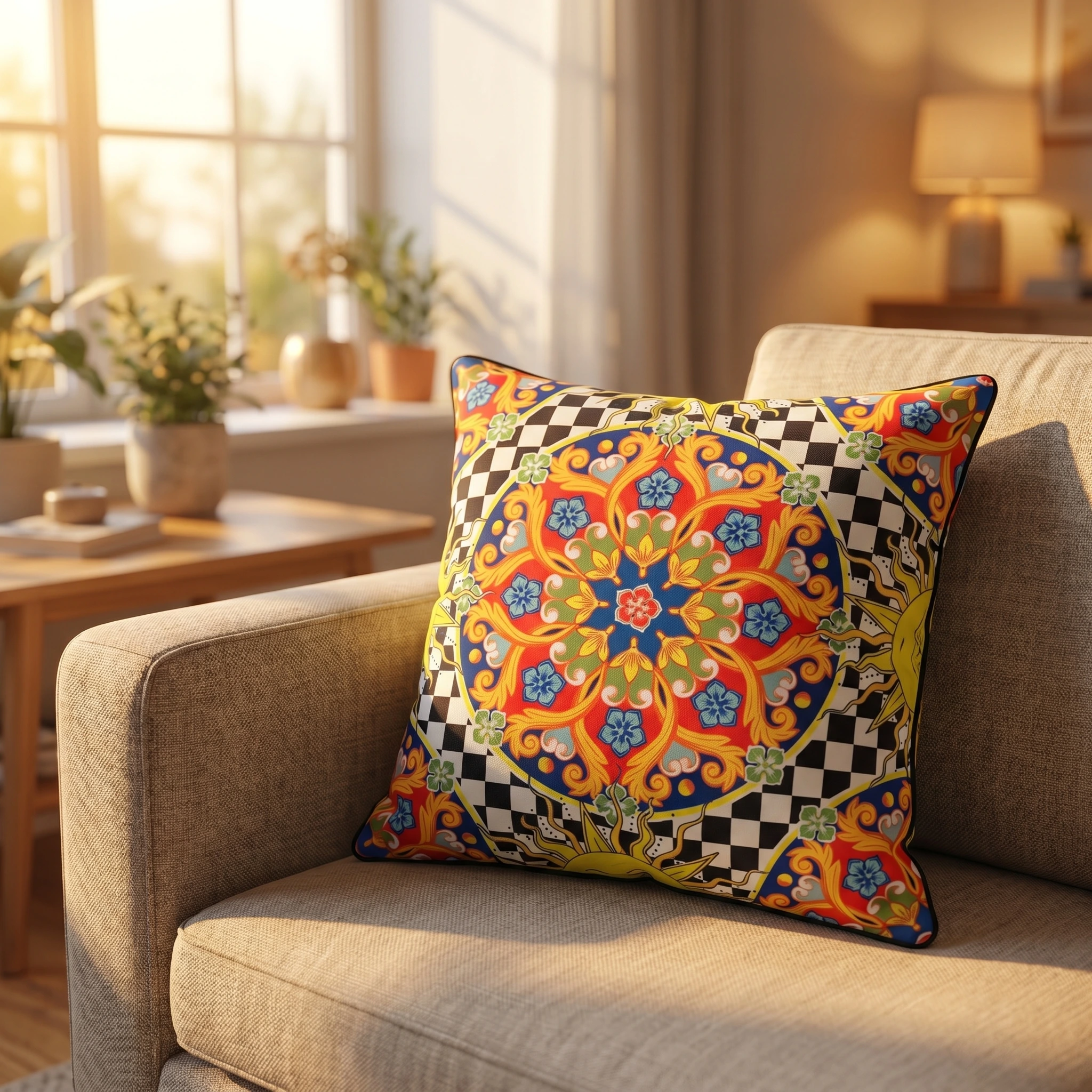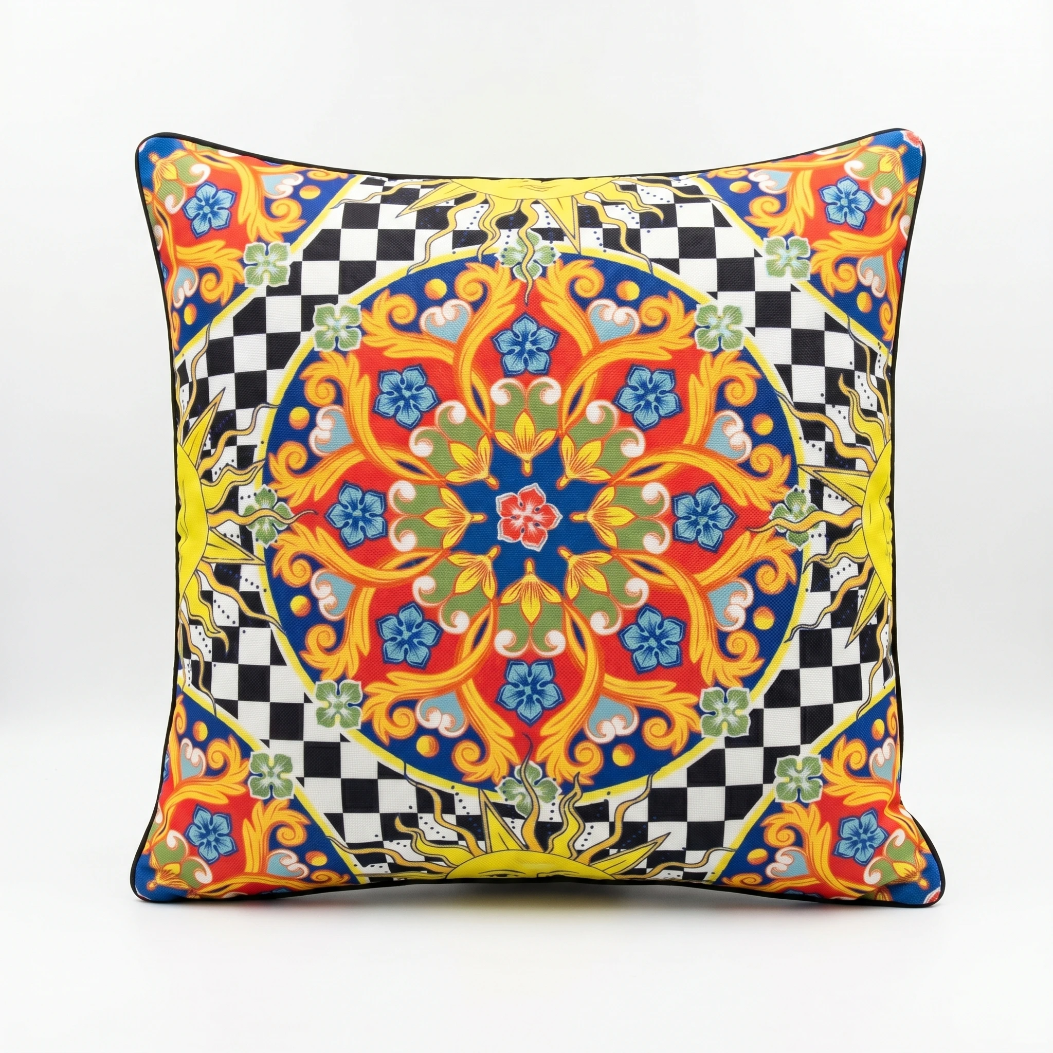 Siyah, beyaz ve sarı tonlarında kareli ve çiçek desenli kırlent kılıfı. Alt kısmında fermuar detayı bulunur.