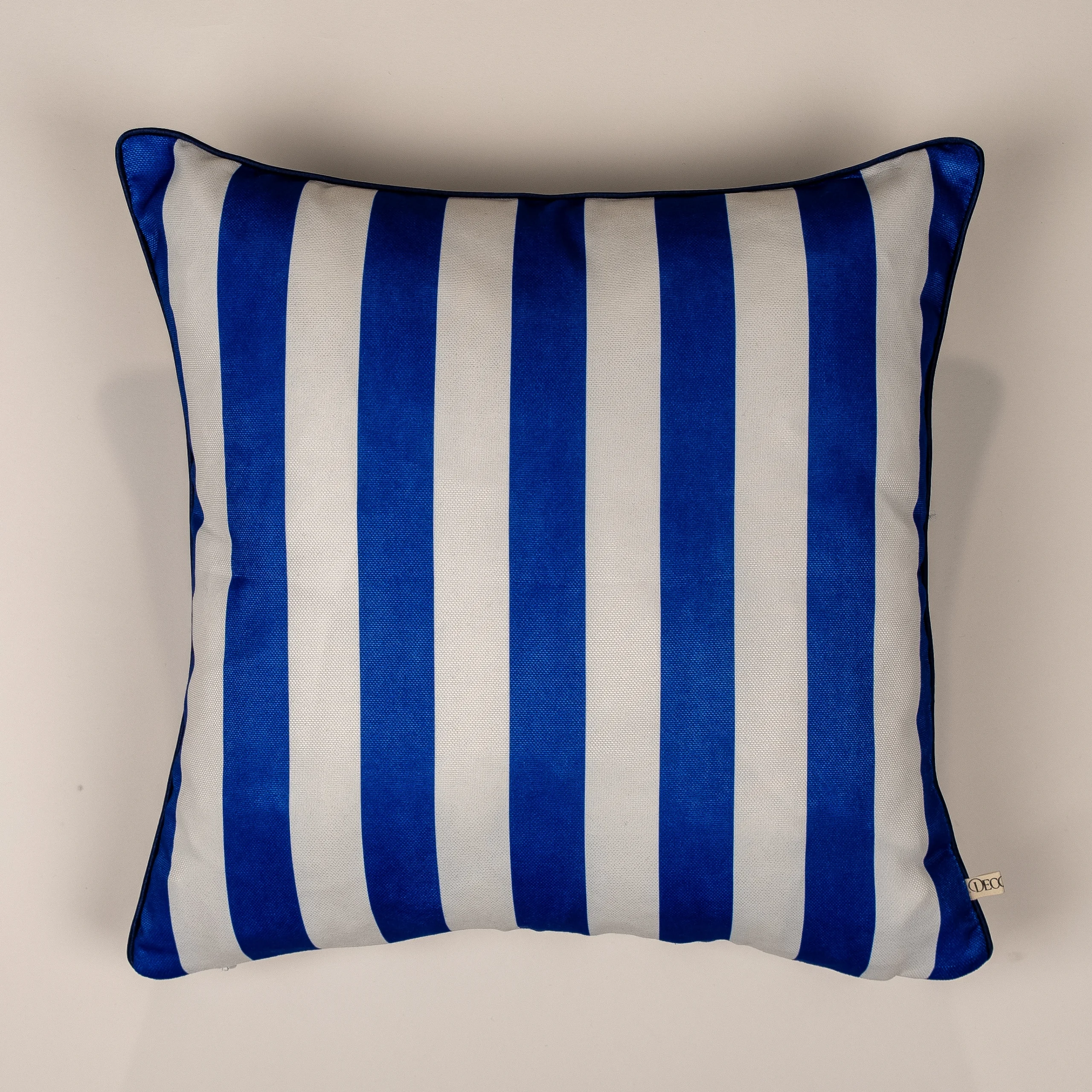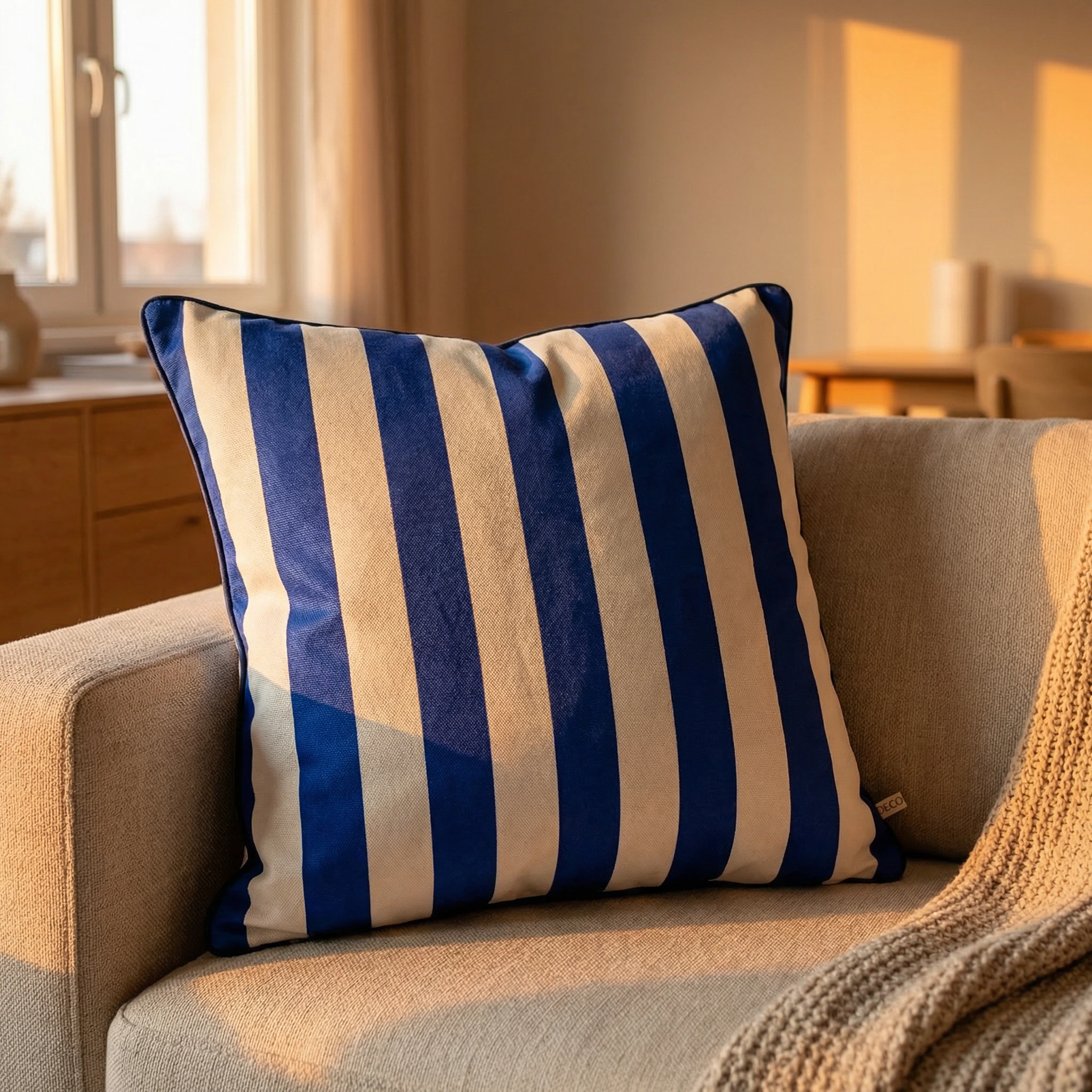 Mavi ve beyaz tonlarında çizgili desenli kırlent kılıfı. Alt kısmında fermuar detayı bulunur.