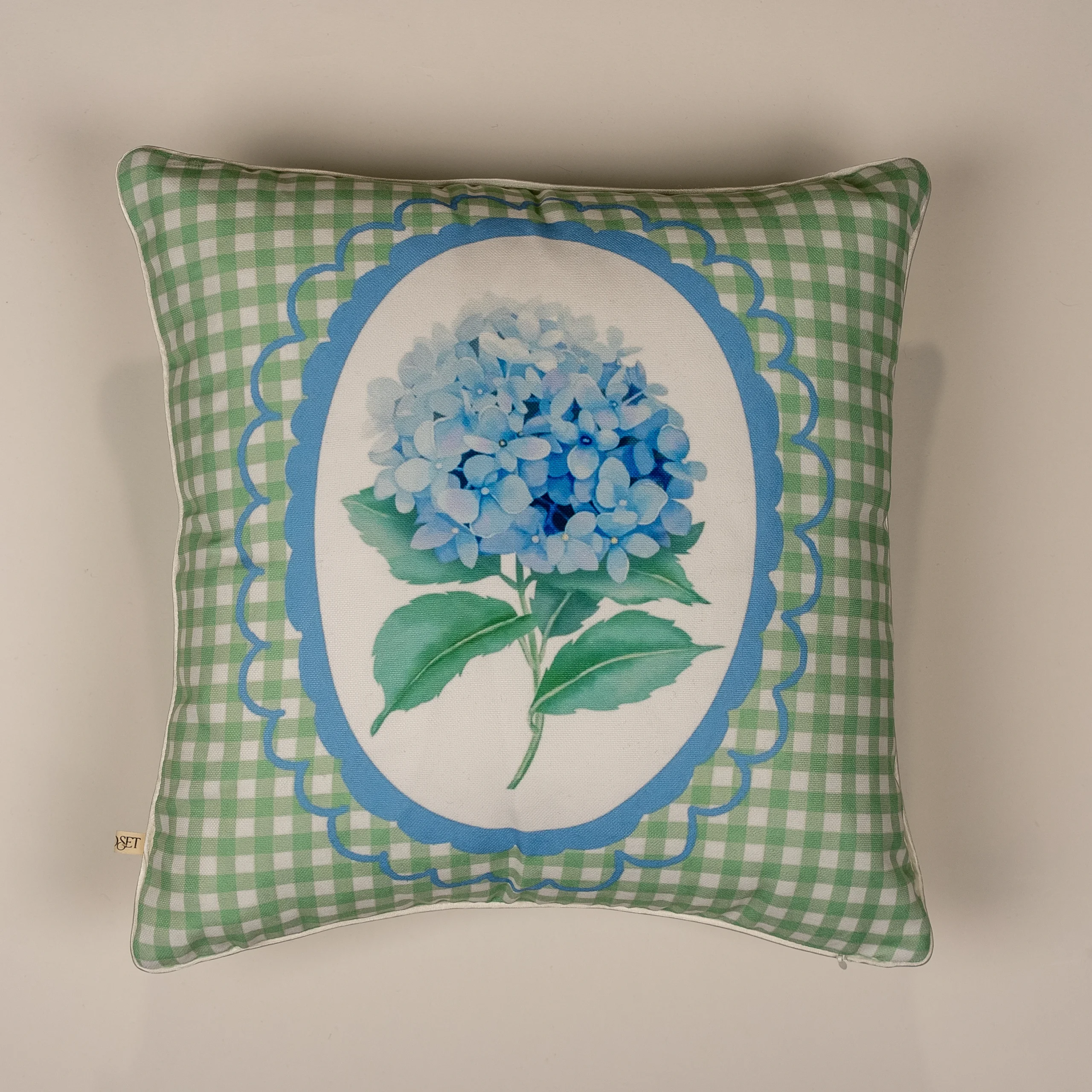 Yeşil ve beyaz tonlarında pötikare desenli, orta bölümünde mavi çiçek motifli kırlent kılıfı. Alt kısmında fermuar detayı bulunur.