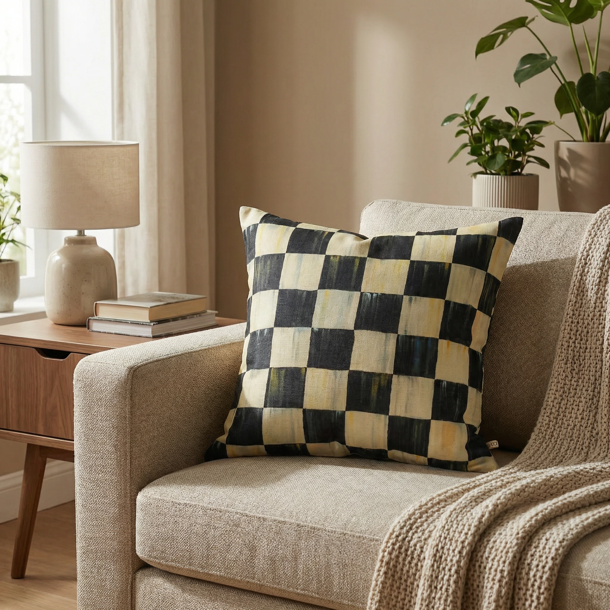 Siyah ve krem tonlarında geometrik desenli kırlent kılıfı. Dokuma kumaştan üretilmiştir. Alt kısmında fermuar detayı bulunur.