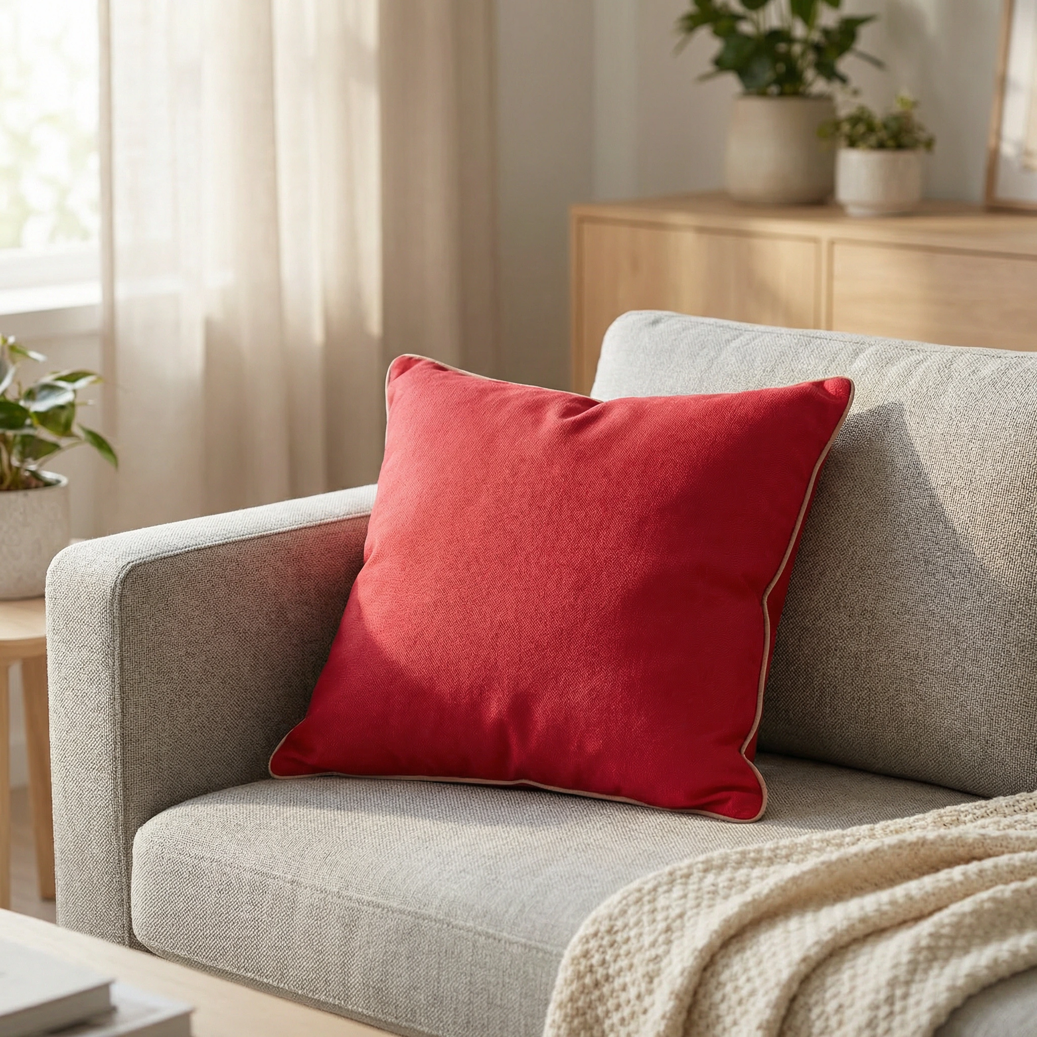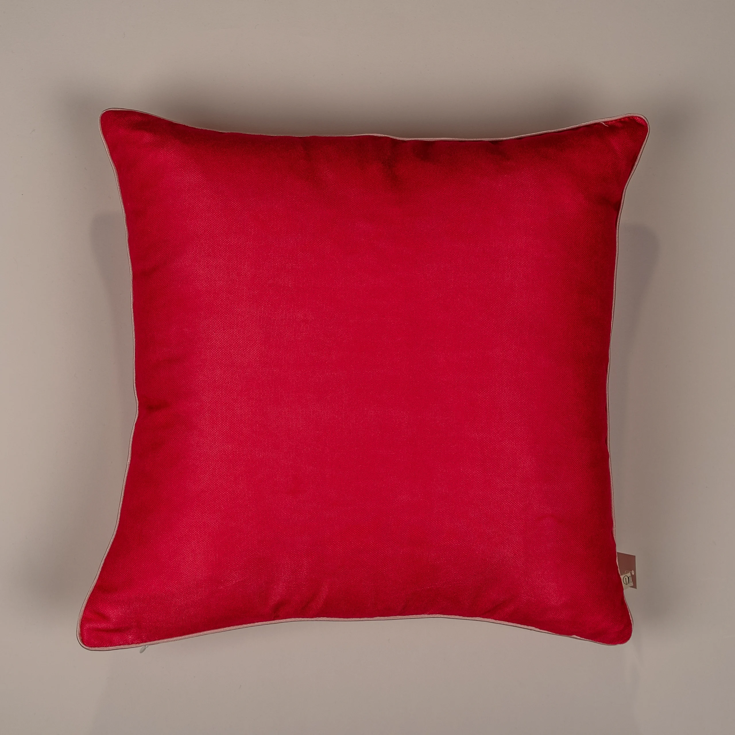 Kırmızı renkli kırlent kılıfı. Alt kısmında fermuar detayı bulunur.