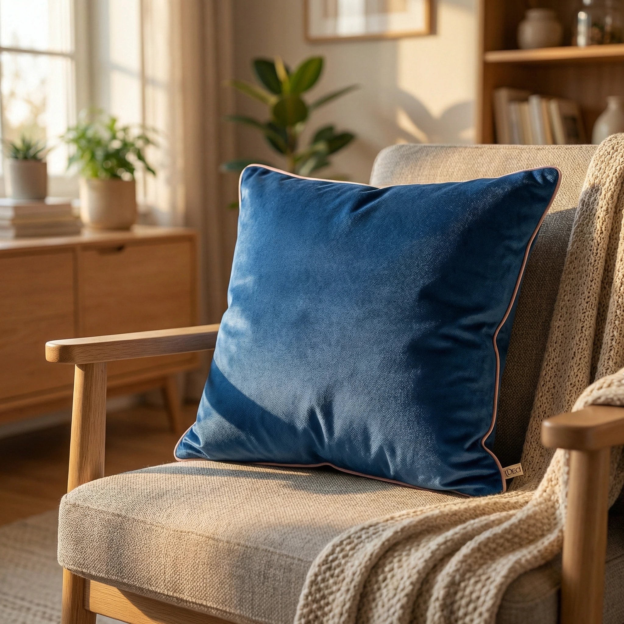 Lacivert renkli kırlent kılıfı. Alt kısmında fermuar detayı bulunur.