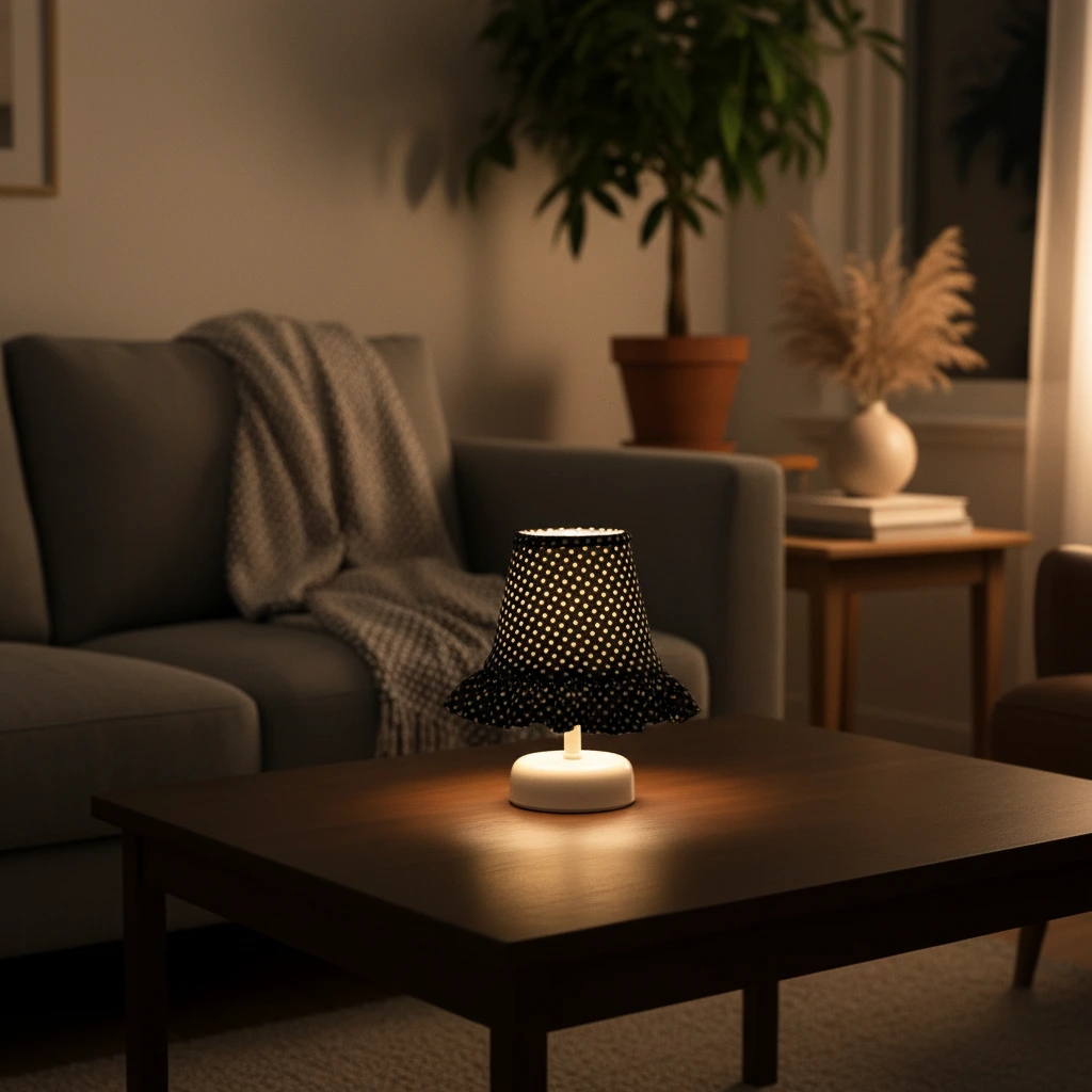 Küçük beyaz puantiye desenli siyah kumaş abajur başlığı, ışık yandığında deliklerden süzülen sıcak bir ışık efekti oluşturur. Alt kısmındaki fırfır detay başlığa hacim kazandırırken, beyaz yuvarlak tabanı tasarımı dengeler. Ortama loş, samimi ve dekoratif bir ambiyans katar. Sehpa, komodin veya masa üzerinde kullanıma uygundur.