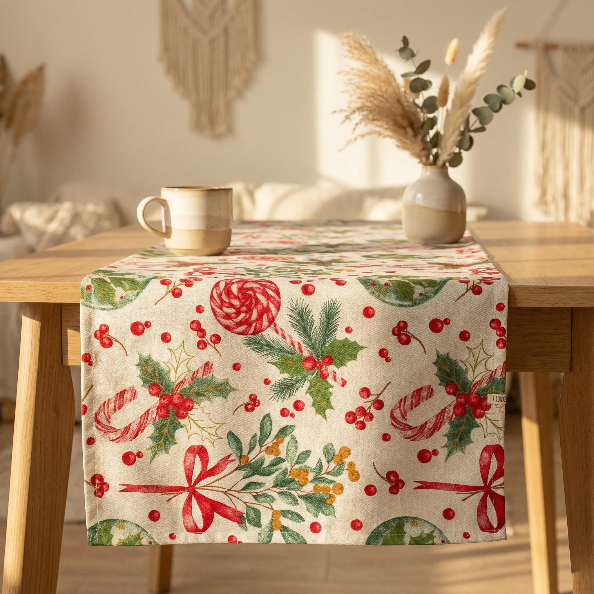 Yılbaşı temalı desenlere sahip masa runnerı. Çam dalları, kırmızı meyveler ve fiyonk detayları ile sıcak ve dekoratif bir görünüm sunar.